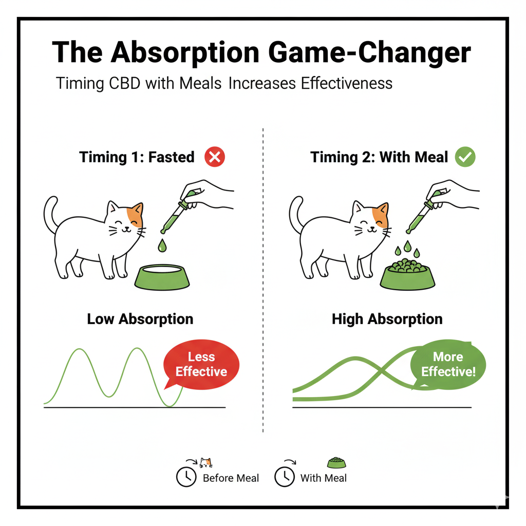 Here's a crucial detail many CBD sellers won't tell you: timing matters enormously. Research indicates that CBD absorption significantly improves when administered shortly after meals rather than to fasted cats. This simple adjustment can dramatically increase effectiveness while potentially reducing required dosages.