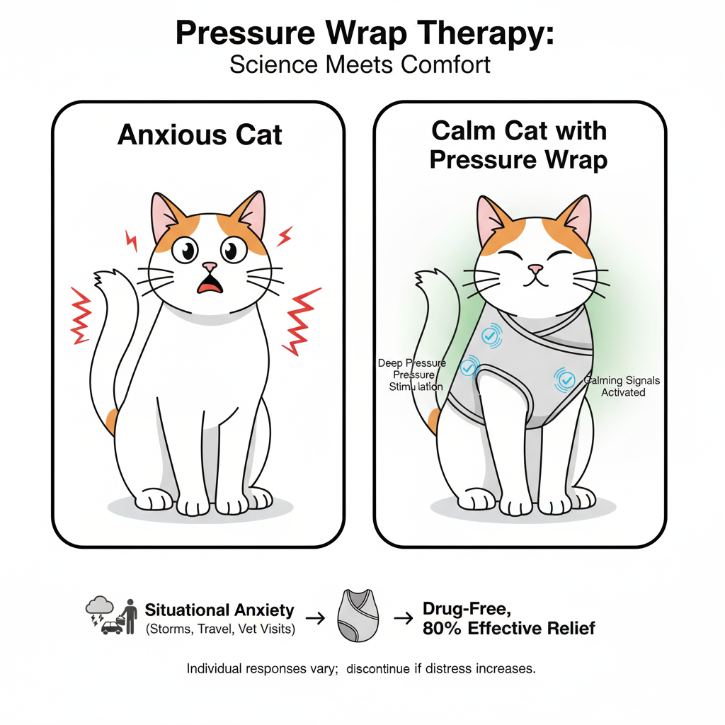 Pressure wraps work by applying gentle, constant pressure similar to swaddling, producing calming effects through deep pressure stimulation. These products activate pressure-sensitive neurons that can override anxiety signals, creating immediate relief for many cats.