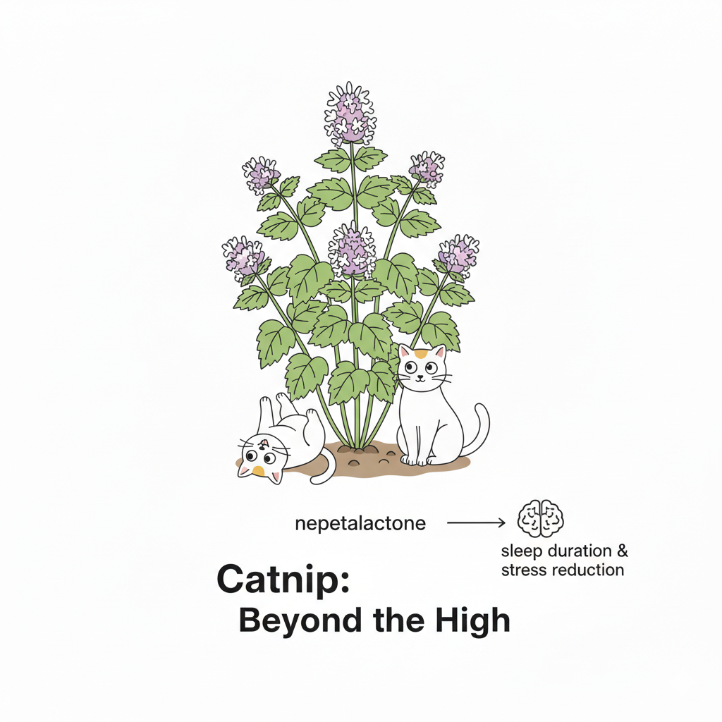 While famous for its stimulating effects, catnip provides calming benefits through its influence on sleep patterns. Research demonstrates that catnip increases sleep duration, contributing to overall stress reduction. The active compound nepetalactone affects approximately 50-70% of cats, with genetics determining individual responses.