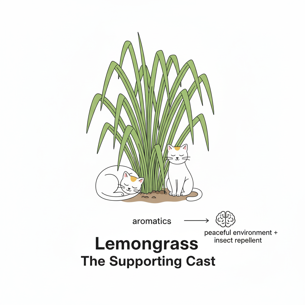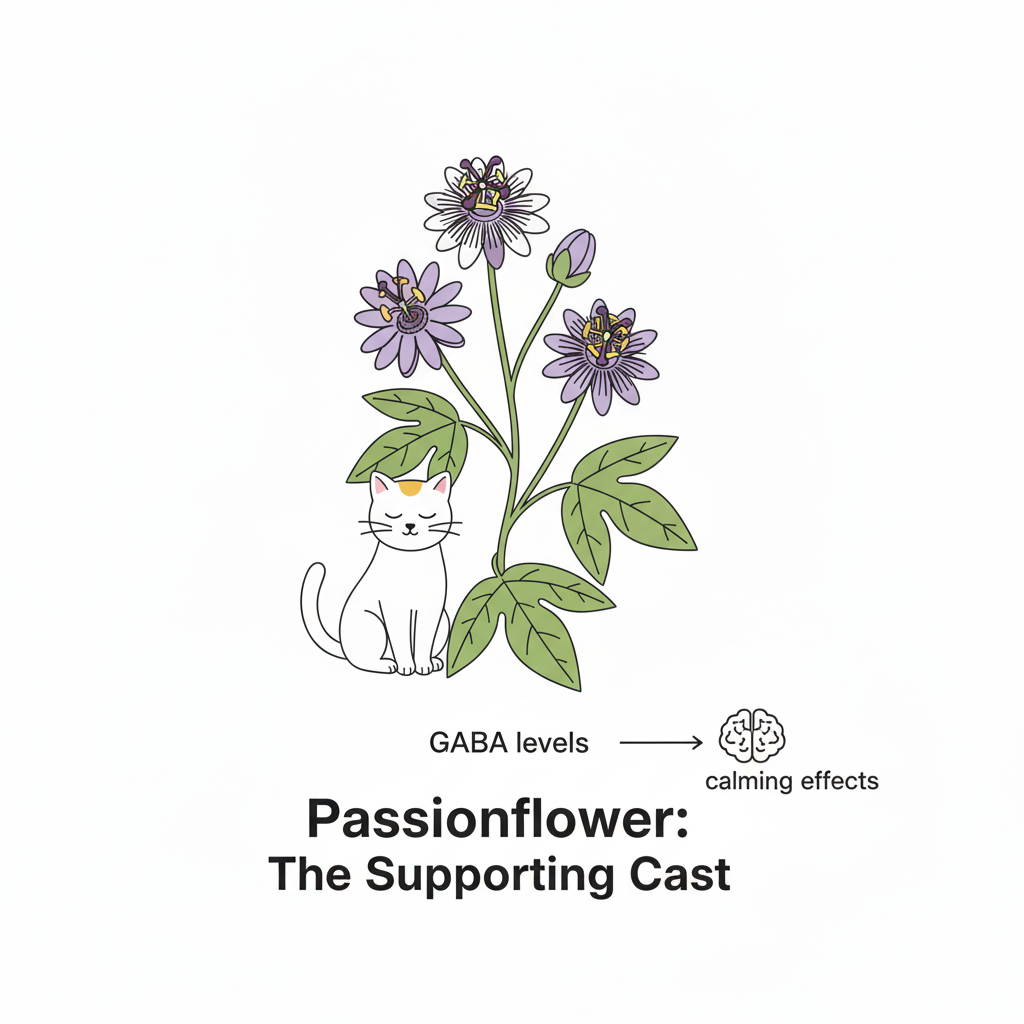 Passionflower increases GABA levels in the brain, providing direct calming effects particularly useful for hyperactive or restless cats. Lemongrass creates peaceful environments through calming aromatics while doubling as a natural insect repellent.